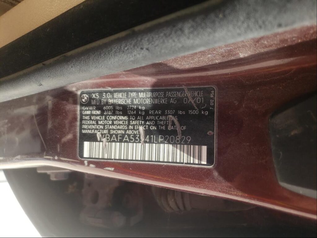 This 2001 BMW X5 (Red) comes from a major insurance auction in the USA or Canada. All information on this page is linked to the vehicle’s VIN (WBAFA53541LP20829), which helps confirm where the car was listed and what condition it was in at the time of sale.