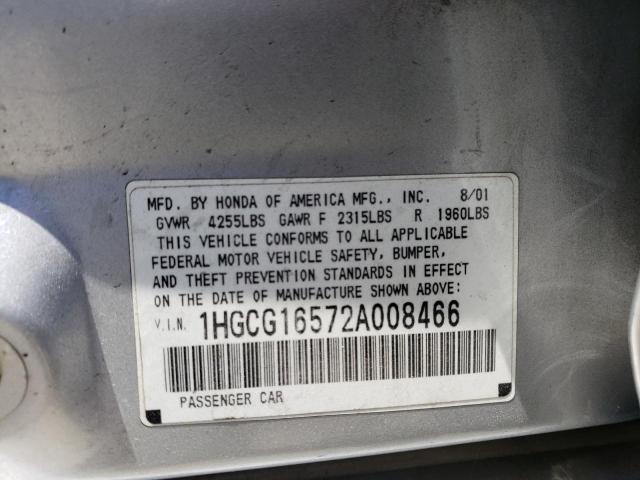 This 2002 Honda Accord (Grey) comes from a major insurance auction in the USA or Canada. All information on this page is linked to the vehicle’s VIN (1HGCG16572A008466), which helps confirm where the car was listed and what condition it was in at the time of sale.