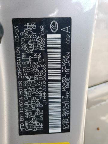 This 2003 Lexus Es300 (Beige) comes from a major insurance auction in the USA or Canada. All information on this page is linked to the vehicle’s VIN (JTHBF30GX36006815), which helps confirm where the car was listed and what condition it was in at the time of sale.