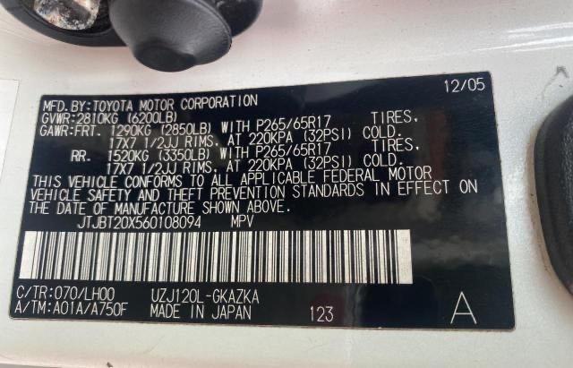 This 2006 Lexus GX (White) comes from a major insurance auction in the USA or Canada. All information on this page is linked to the vehicle’s VIN (JTJBT20X560108094), which helps confirm where the car was listed and what condition it was in at the time of sale.