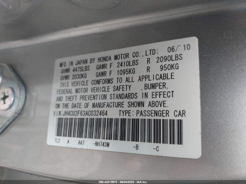 This 2010 ACURA TSX (Unknown Color) comes from a major insurance auction in the USA or Canada. All information on this page is linked to the vehicle’s VIN (JH4CU2F63AC032464), which helps confirm where the car was listed and what condition it was in at the time of sale.