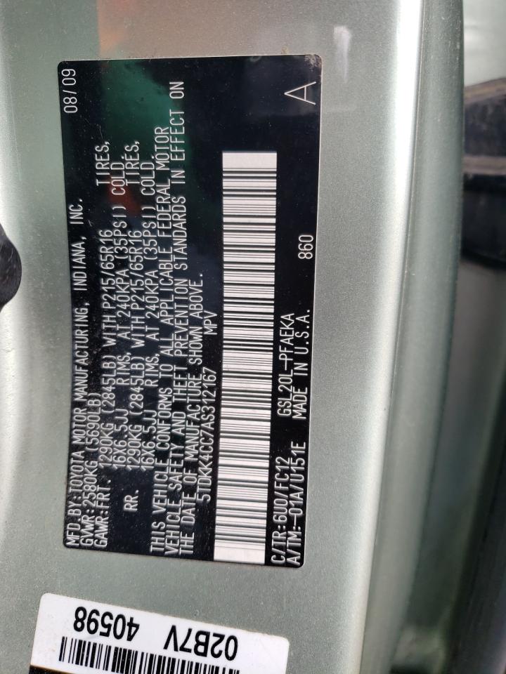 This 2010 Toyota Sienna (Green) comes from a major insurance auction in the USA or Canada. All information on this page is linked to the vehicle’s VIN (5TDKK4CC7AS312167), which helps confirm where the car was listed and what condition it was in at the time of sale.