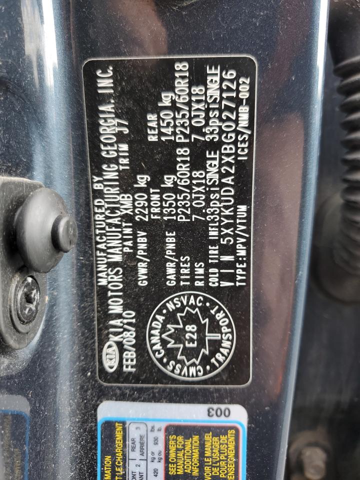This 2011 Kia Sorento (Blue) comes from a major insurance auction in the USA or Canada. All information on this page is linked to the vehicle’s VIN (5XYKUDA2XBG027126), which helps confirm where the car was listed and what condition it was in at the time of sale.