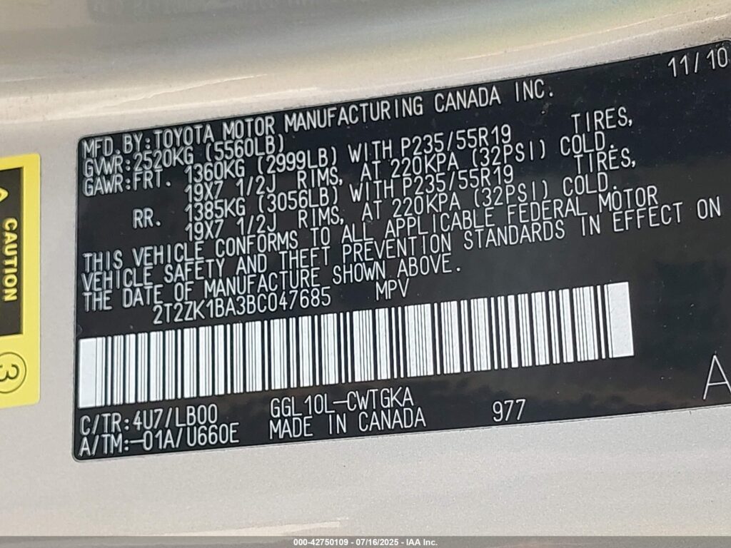 | VIN Number | 2T2ZK1BA3BC047685 |