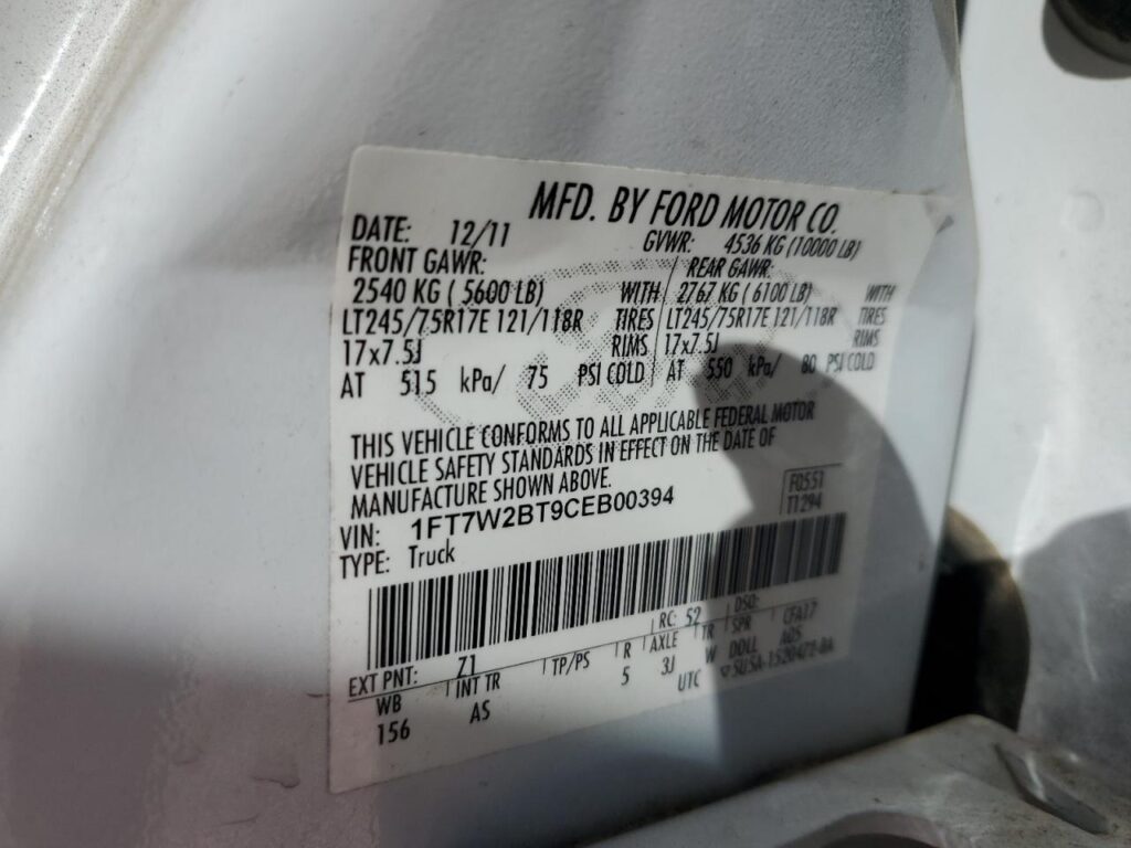 | VIN Number | 1FT7W2BT9CEB00394 |