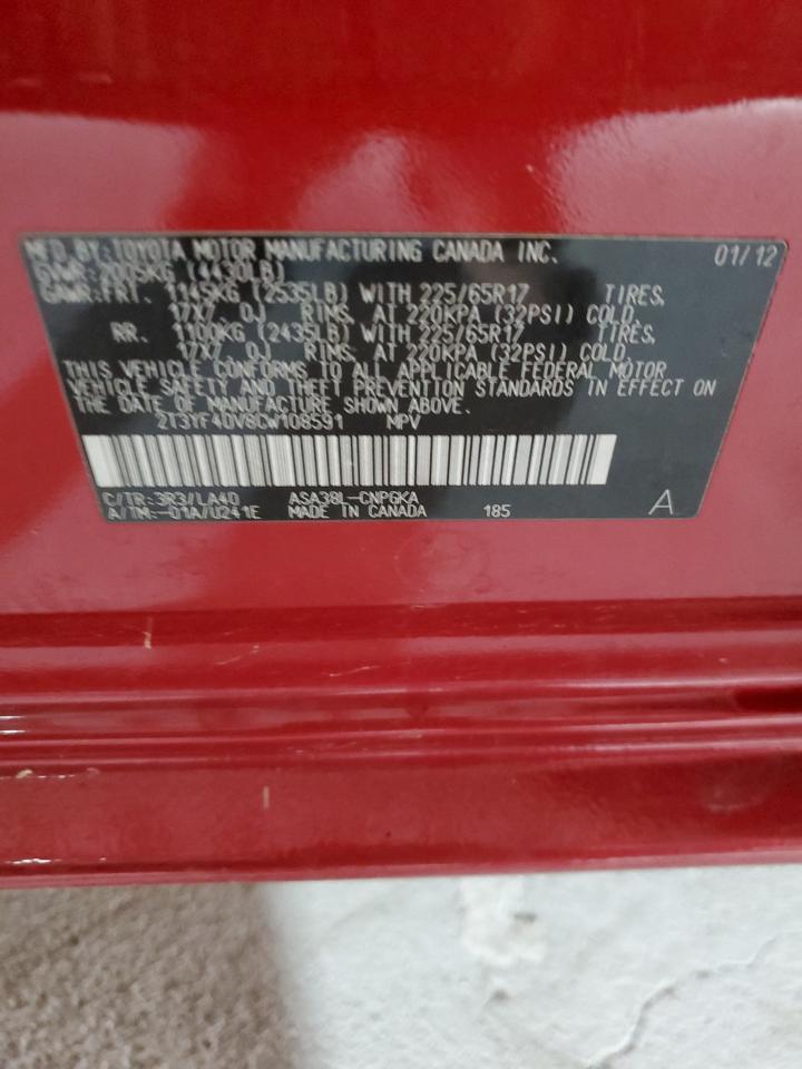 This 2012 TOYOTA RAV4 (RED) comes from a major insurance auction in the USA or Canada. All information on this page is linked to the vehicle’s VIN (2T3YF4DV8CW108591), which helps confirm where the car was listed and what condition it was in at the time of sale.