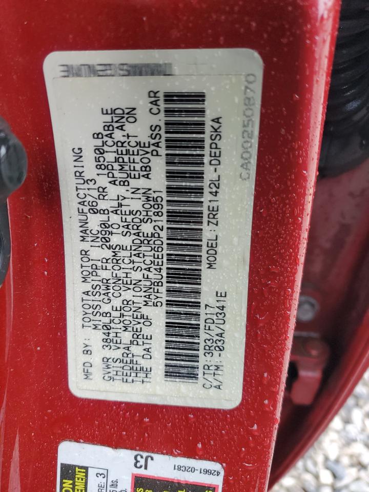 This 2013 Toyota Corolla (Red) comes from a major insurance auction in the USA or Canada. All information on this page is linked to the vehicle’s VIN (5YFBU4EE6DP218951), which helps confirm where the car was listed and what condition it was in at the time of sale.