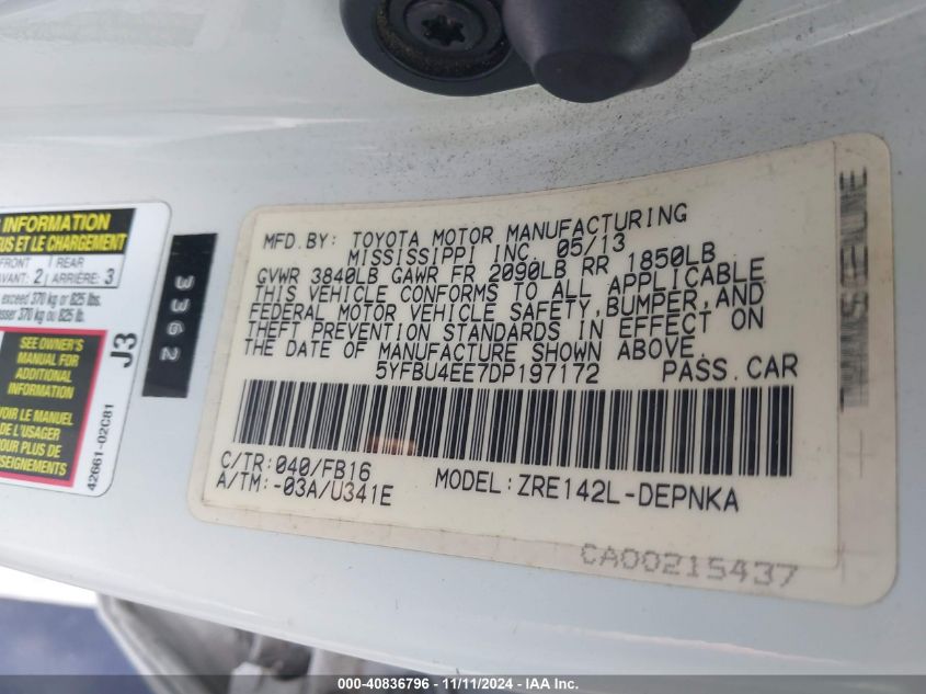 This 2013 TOYOTA COROLLA (White) comes from a major insurance auction in the USA or Canada. All information on this page is linked to the vehicle’s VIN (5YFBU4EE7DP197172), which helps confirm where the car was listed and what condition it was in at the time of sale.