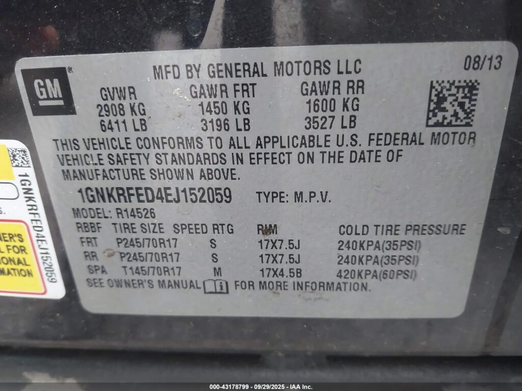 This 2014 Chevrolet Traverse (Brown) comes from a major insurance auction in the USA or Canada. All information on this page is linked to the vehicle’s VIN (1GNKRFED4EJ152059), which helps confirm where the car was listed and what condition it was in at the time of sale.