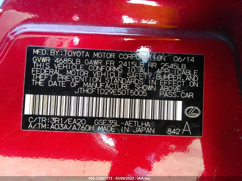 This 2014 Lexus IS 250 (Red) comes from a major insurance auction in the USA or Canada. All information on this page is linked to the vehicle’s VIN (JTHCF1D29E5015005), which helps confirm where the car was listed and what condition it was in at the time of sale.