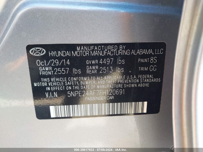 | VIN Number | 5NPE24AF7FH120691 |