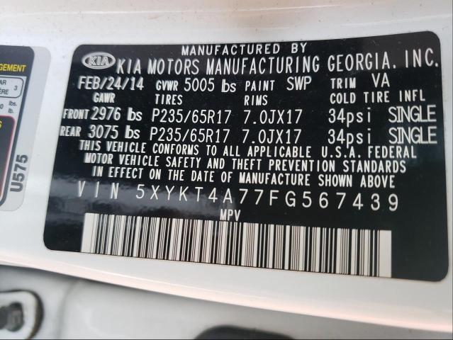 This 2015 KIA SORENTO (WHITE) comes from a major insurance auction in the USA or Canada. All information on this page is linked to the vehicle’s VIN (5XYKT4A77FG567439), which helps confirm where the car was listed and what condition it was in at the time of sale.