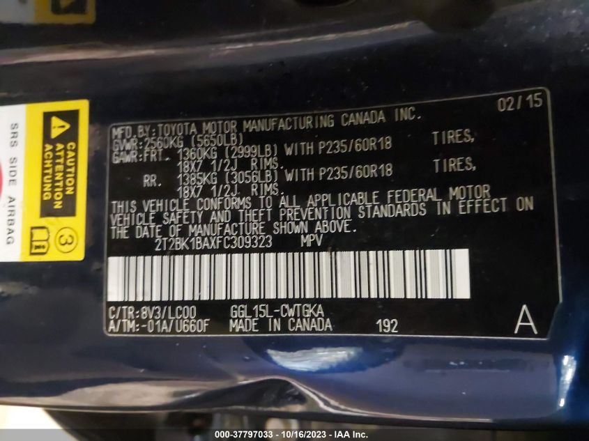 | VIN Number | 2T2BK1BAXFC309323 |