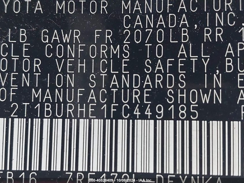 This 2015 TOYOTA COROLLA (Unknown Color) comes from a major insurance auction in the USA or Canada. All information on this page is linked to the vehicle’s VIN (2T1BURHE1FC449185), which helps confirm where the car was listed and what condition it was in at the time of sale.
