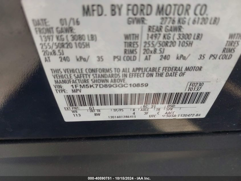 This 2016 FORD EXPLORER (Unknown Color) comes from a major insurance auction in the USA or Canada. All information on this page is linked to the vehicle’s VIN (1FM5K7D89GGC10859), which helps confirm where the car was listed and what condition it was in at the time of sale.