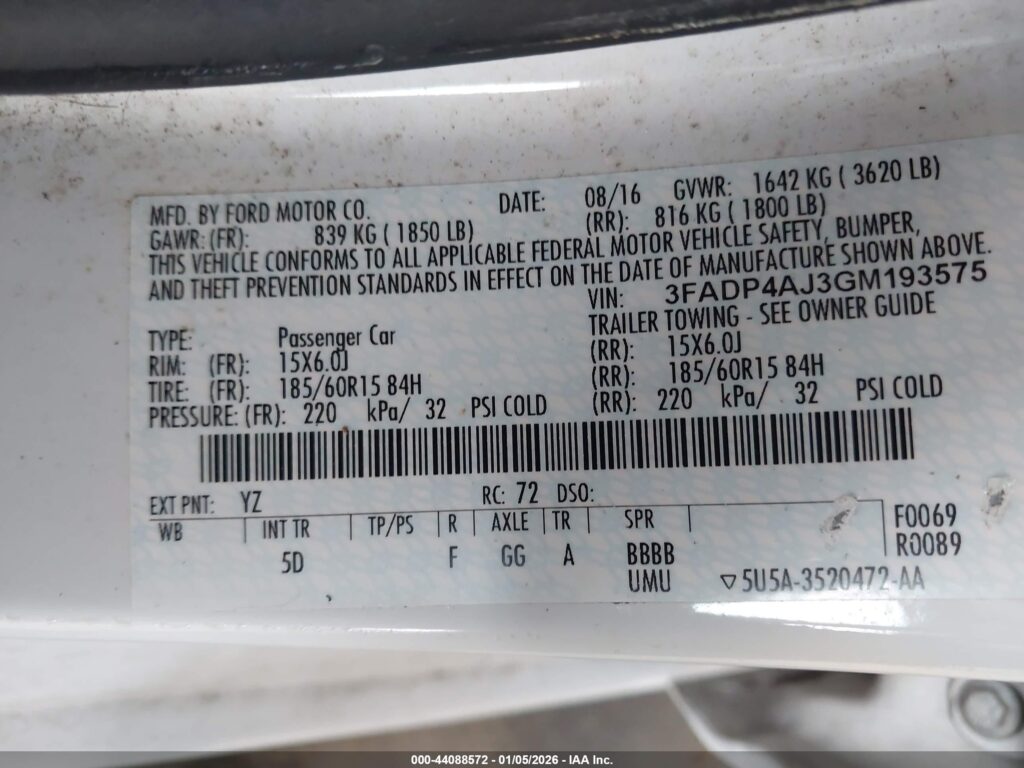 This 2016 Ford Fiesta (White) comes from a major insurance auction in the USA or Canada. All information on this page is linked to the vehicle’s VIN (3FADP4AJ3GM193575), which helps confirm where the car was listed and what condition it was in at the time of sale.