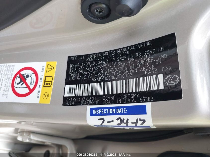 This 2016 Lexus ES 350 (Gold) comes from a major insurance auction in the USA or Canada. All information on this page is linked to the vehicle’s VIN (58ABK1GG0GU010353), which helps confirm where the car was listed and what condition it was in at the time of sale.