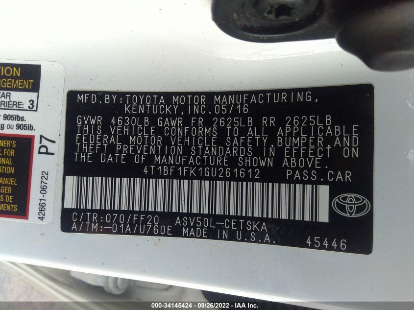 | VIN Number | 4T1BF1FK1GU261612 |