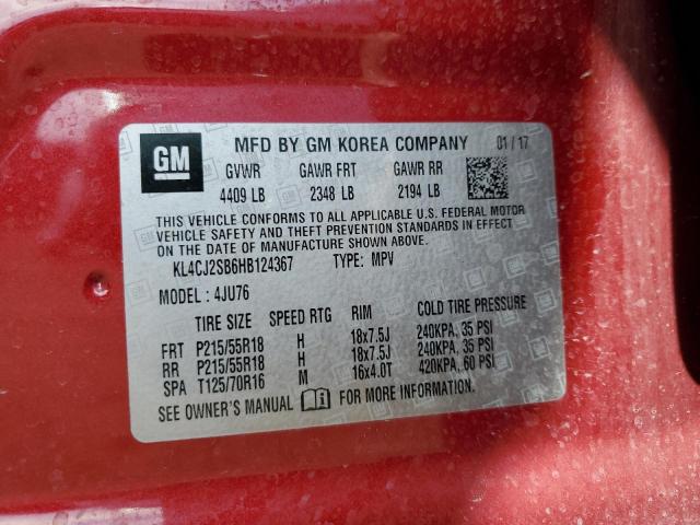 This 2017 Buick Encore (Red) comes from a major insurance auction in the USA or Canada. All information on this page is linked to the vehicle’s VIN (KL4CJ2SB6HB124367), which helps confirm where the car was listed and what condition it was in at the time of sale.