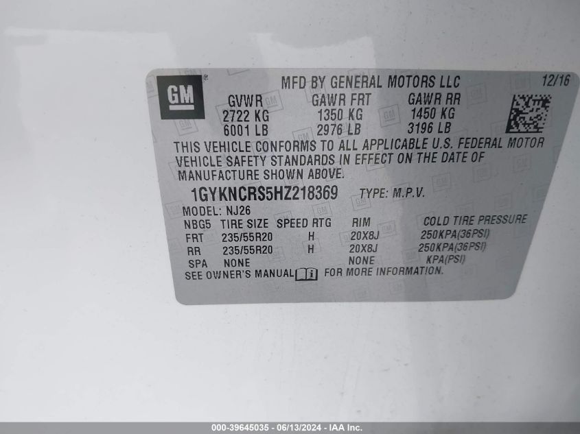| VIN Number | 1GYKNCRS5HZ218369 |