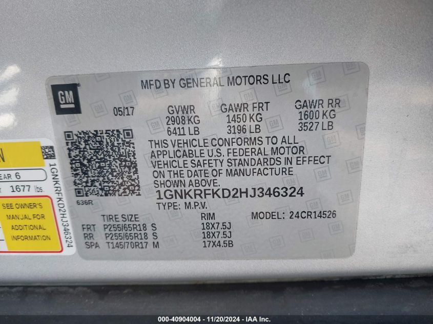 | VIN Number | 1GNKRFKD2HJ346324 |