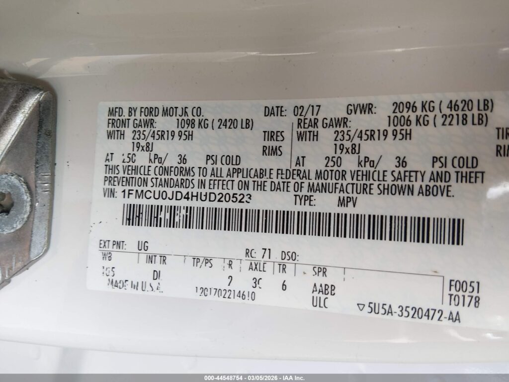This 2017 Ford Escape (White) comes from a major insurance auction in the USA or Canada. All information on this page is linked to the vehicle’s VIN (1FMCU0JD4HUD20523), which helps confirm where the car was listed and what condition it was in at the time of sale.