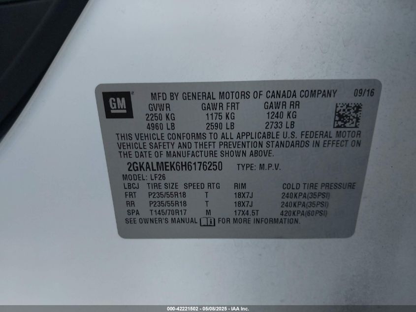 | VIN Number | 2GKALMEK6H6176250 |