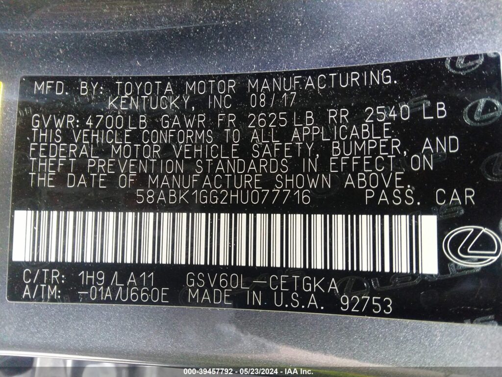 This 2017 Lexus ES 350 (Grey) comes from a major insurance auction in the USA or Canada. All information on this page is linked to the vehicle’s VIN (58ABK1GG2HU077716), which helps confirm where the car was listed and what condition it was in at the time of sale.