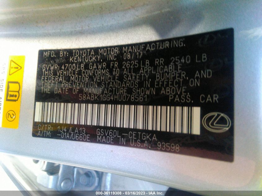 This 2017 Lexus ES 350 (Other) comes from a major insurance auction in the USA or Canada. All information on this page is linked to the vehicle’s VIN (58ABK1GG4HU078561), which helps confirm where the car was listed and what condition it was in at the time of sale.