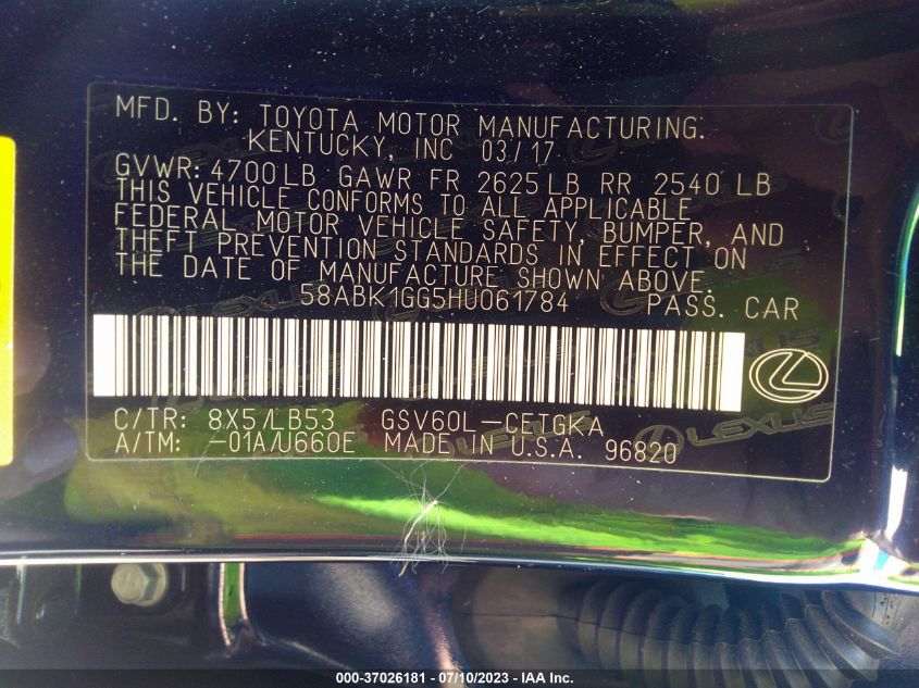 This 2017 Lexus ES 350 (Other) comes from a major insurance auction in the USA or Canada. All information on this page is linked to the vehicle’s VIN (58ABK1GG5HU061784), which helps confirm where the car was listed and what condition it was in at the time of sale.