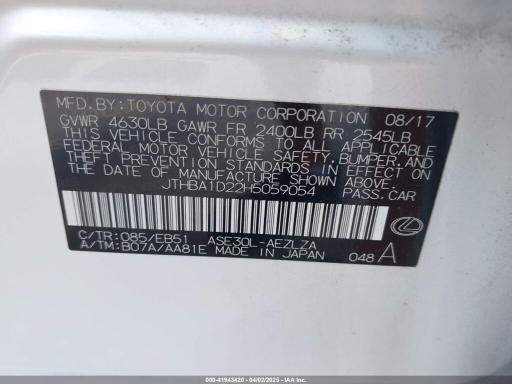 VIN: JTHBA1D22H5059054