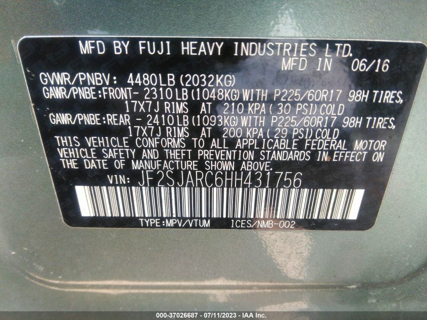 | VIN Number | JF2SJARC6HH431756 |