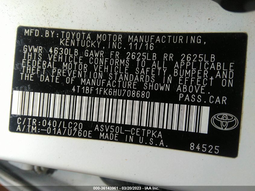 This 2017 Toyota Camry (White) comes from a major insurance auction in the USA or Canada. All information on this page is linked to the vehicle’s VIN (4T1BF1FK6HU708680), which helps confirm where the car was listed and what condition it was in at the time of sale.