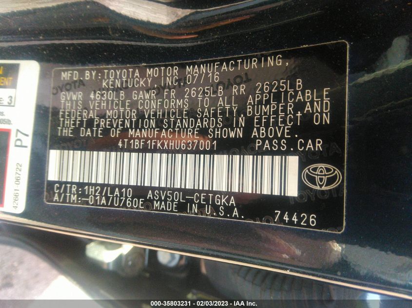 2017 TOYOTA CAMRY – 4T1BF1FKXHU637001