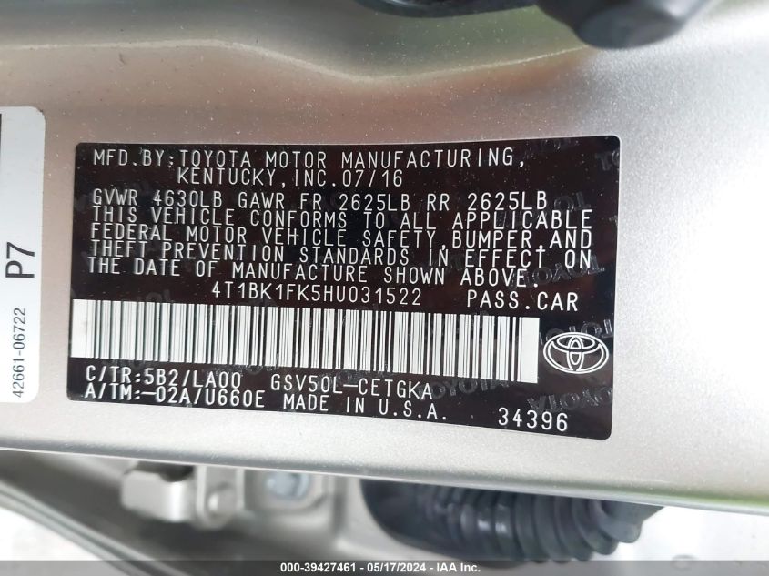 2017 TOYOTA CAMRY – 4T1BK1FK5HU031522