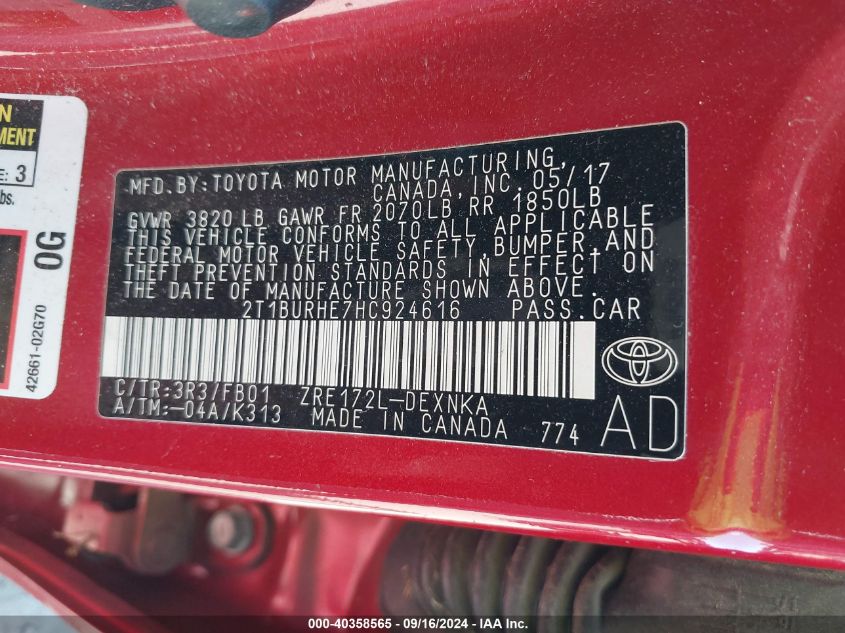 This 2017 TOYOTA COROLLA (Red) comes from a major insurance auction in the USA or Canada. All information on this page is linked to the vehicle’s VIN (2T1BURHE7HC924616), which helps confirm where the car was listed and what condition it was in at the time of sale.