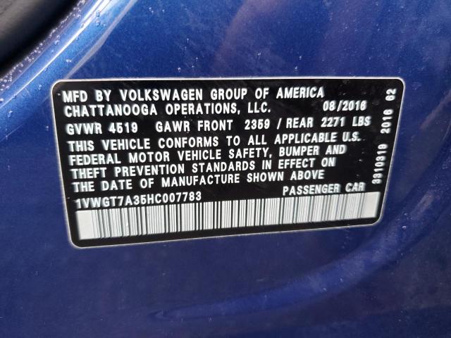 This 2017 Volkswagen Passat (Blue) comes from a major insurance auction in the USA or Canada. All information on this page is linked to the vehicle’s VIN (1VWGT7A35HC007783), which helps confirm where the car was listed and what condition it was in at the time of sale.