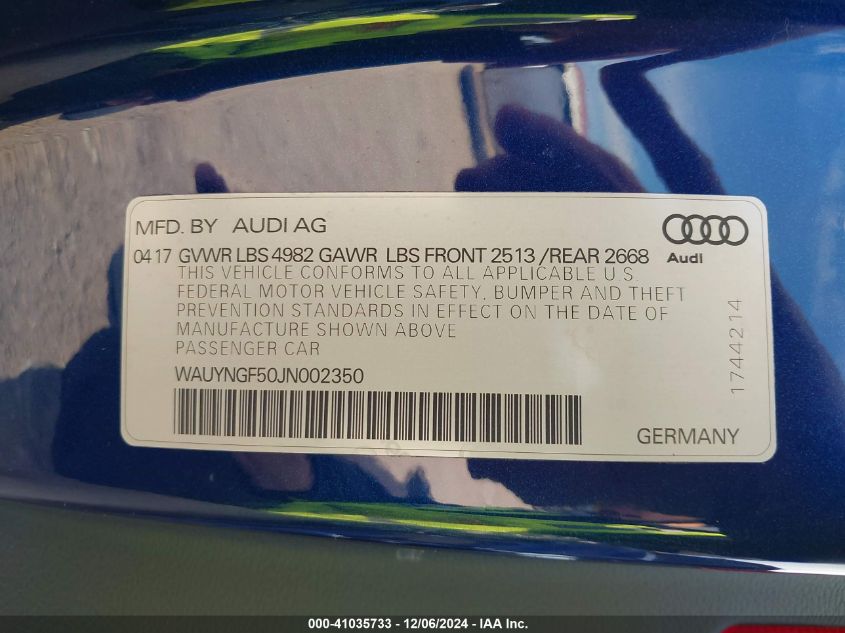 This 2018 AUDI A5 (Unknown Color) comes from a major insurance auction in the USA or Canada. All information on this page is linked to the vehicle’s VIN (WAUYNGF50JN002350), which helps confirm where the car was listed and what condition it was in at the time of sale.
