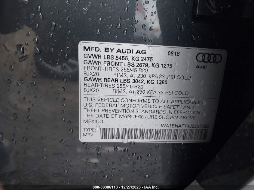 This 2018 Audi Q5 (Grey) comes from a major insurance auction in the USA or Canada. All information on this page is linked to the vehicle’s VIN (WA1BNAFY4J2237782), which helps confirm where the car was listed and what condition it was in at the time of sale.