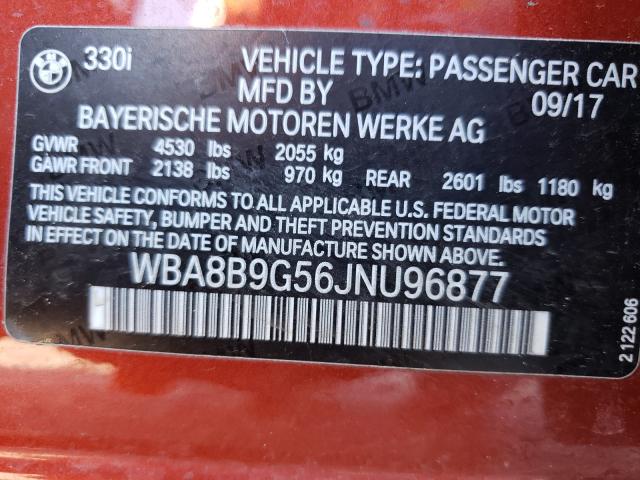 This 2018 BMW 3 Series (Red) comes from a major insurance auction in the USA or Canada. All information on this page is linked to the vehicle’s VIN (WBA8B9G56JNU96877), which helps confirm where the car was listed and what condition it was in at the time of sale.