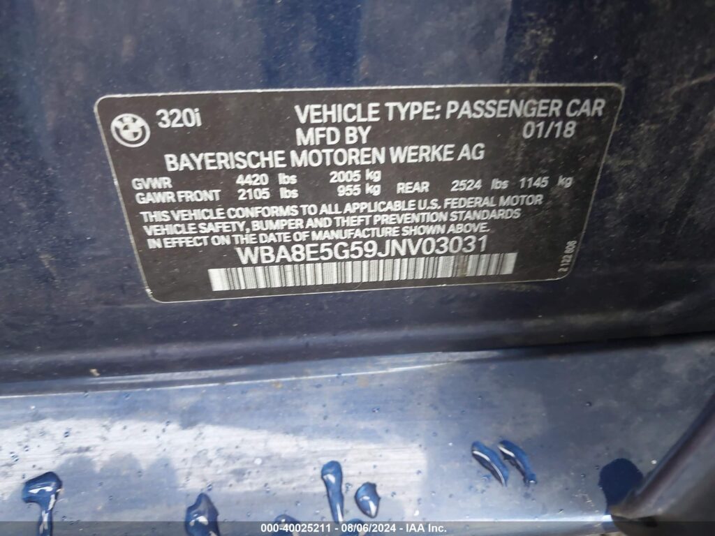 This 2018 BMW 3 Series (Other) comes from a major insurance auction in the USA or Canada. All information on this page is linked to the vehicle’s VIN (WBA8E5G59JNV03031), which helps confirm where the car was listed and what condition it was in at the time of sale.