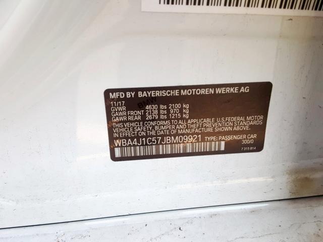 This 2018 BMW 4 Series (White) comes from a major insurance auction in the USA or Canada. All information on this page is linked to the vehicle’s VIN (WBA4J1C57JBM09921), which helps confirm where the car was listed and what condition it was in at the time of sale.