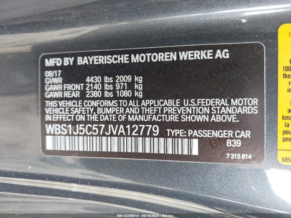 | VIN Number | WBS1J5C57JVA12779 |