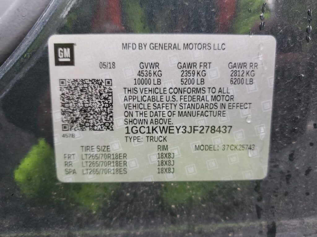 This 2018 CHEVROLET ALL Models (CHARCOAL) comes from a major insurance auction in the USA or Canada. All information on this page is linked to the vehicle’s VIN (1GC1KWEY3JF278437), which helps confirm where the car was listed and what condition it was in at the time of sale.