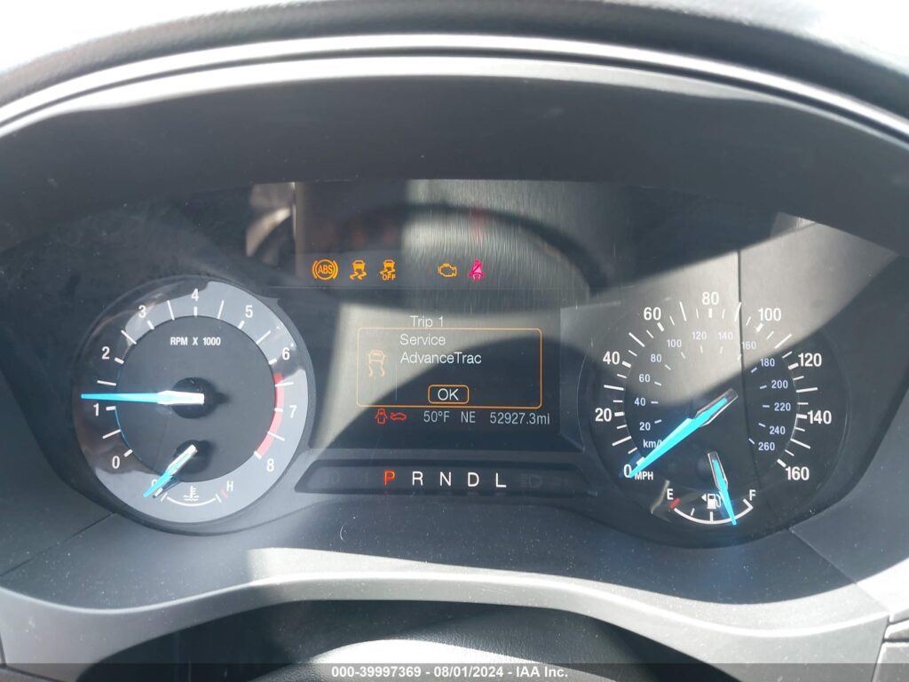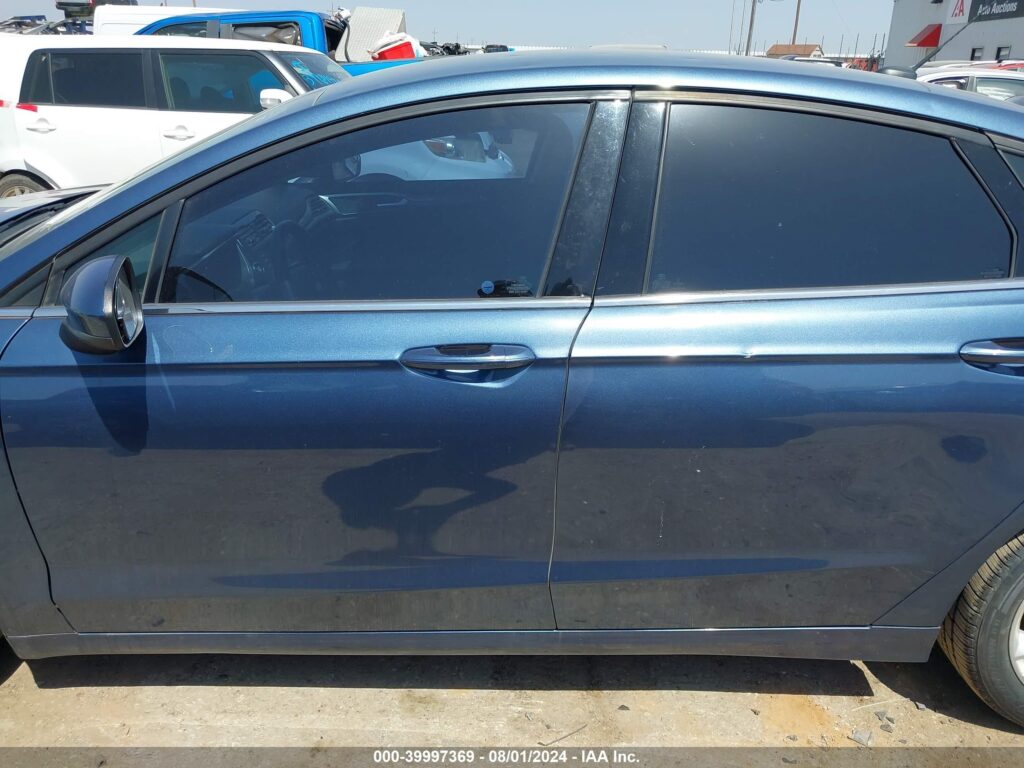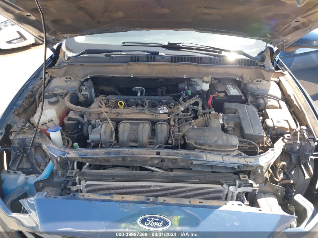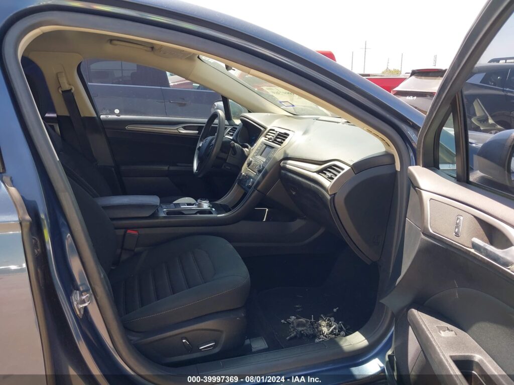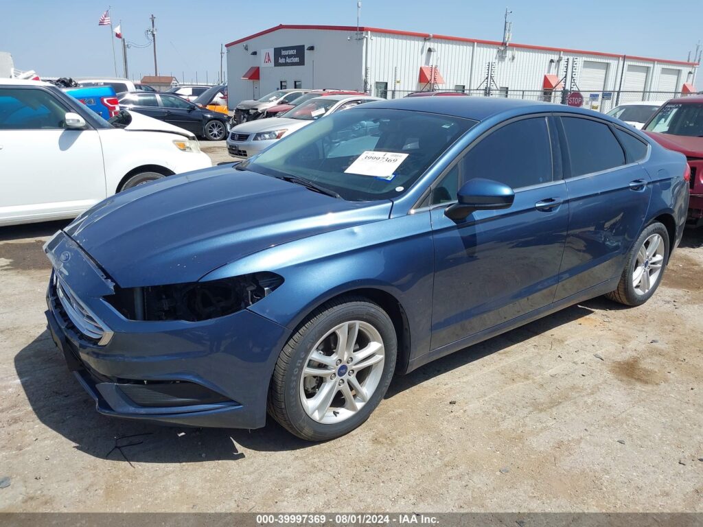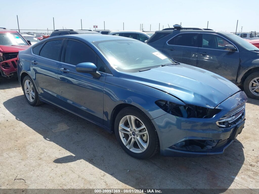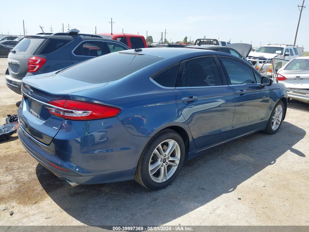 This 2018 Ford Fusion (Blue) is equipped with an engine designed to balance performance and efficiency. According to the auction listing, the vehicle had 52,927 miles at the time of sale.