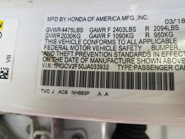 This 2018 Honda Accord (White) comes from a major insurance auction in the USA or Canada. All information on this page is linked to the vehicle’s VIN (1HGCV2F50JA033932), which helps confirm where the car was listed and what condition it was in at the time of sale.