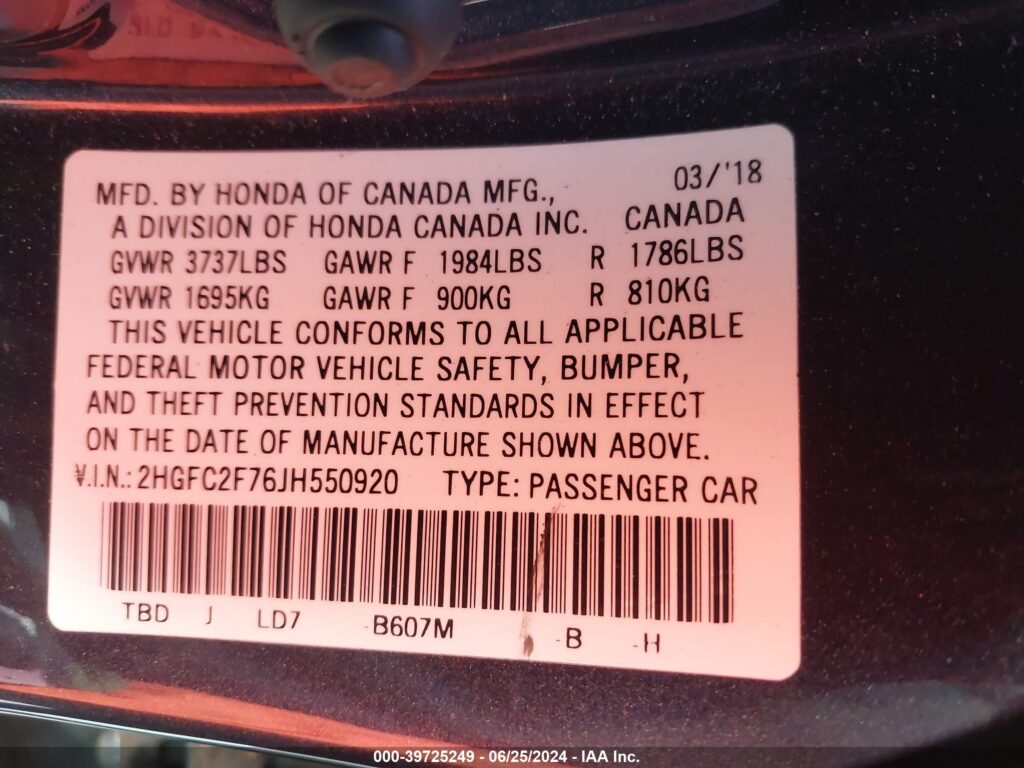 VIN: 2HGFC2F76JH550920