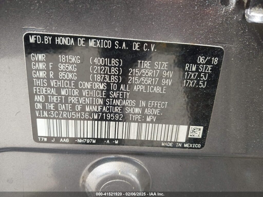 This 2018 Honda Hr-v (Grey) comes from a major insurance auction in the USA or Canada. All information on this page is linked to the vehicle’s VIN (3CZRU5H36JM719592), which helps confirm where the car was listed and what condition it was in at the time of sale.