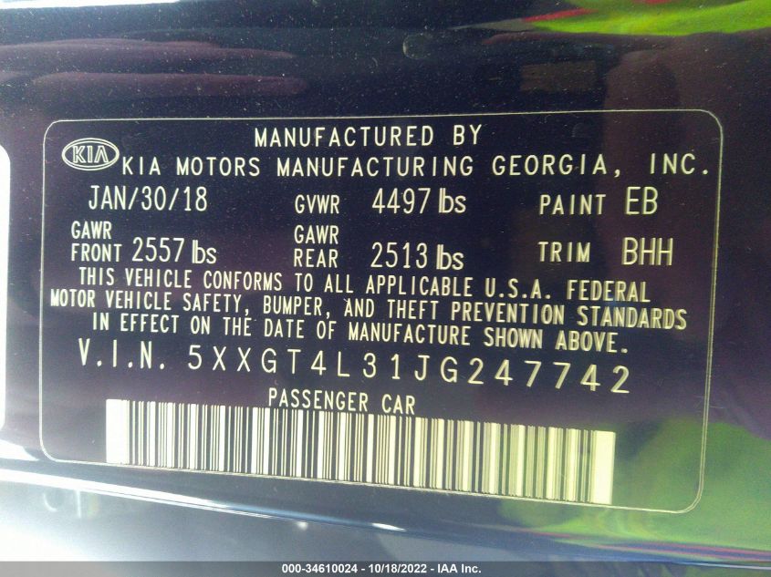 This 2018 Kia Optima (Other) comes from a major insurance auction in the USA or Canada. All information on this page is linked to the vehicle’s VIN (5XXGT4L31JG247742), which helps confirm where the car was listed and what condition it was in at the time of sale.