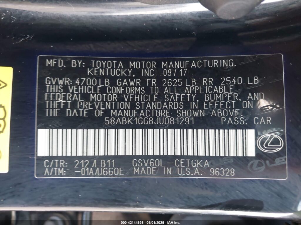 This 2018 Lexus ES 350 (Black) comes from a major insurance auction in the USA or Canada. All information on this page is linked to the vehicle’s VIN (58ABK1GG8JU081291), which helps confirm where the car was listed and what condition it was in at the time of sale.
